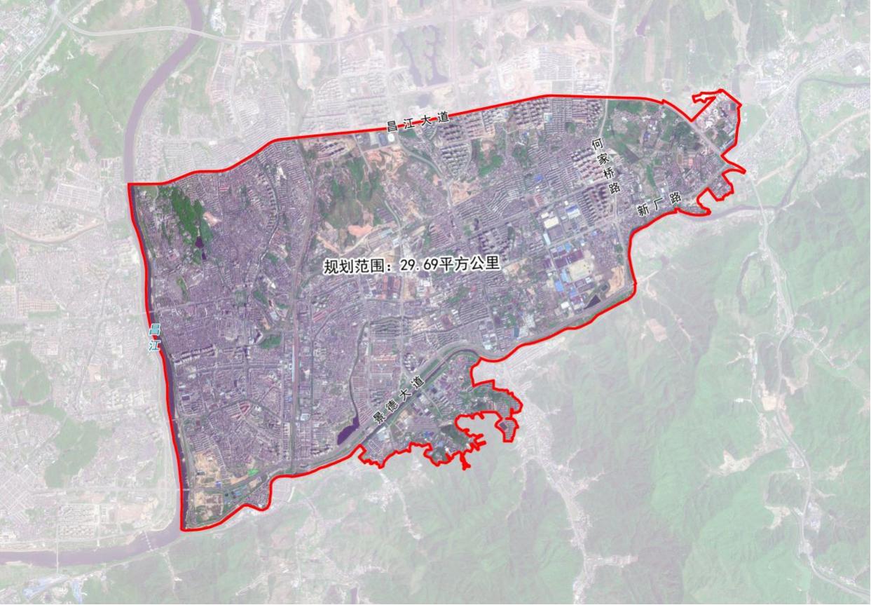 本次规划范围位于景德镇市珠山区河东片区,昌江大道以南,西至昌江,东至黄泥头,南至南山。规划范围包含HD01—HD14共14个详细规划单元,总面积29.69平方公里。