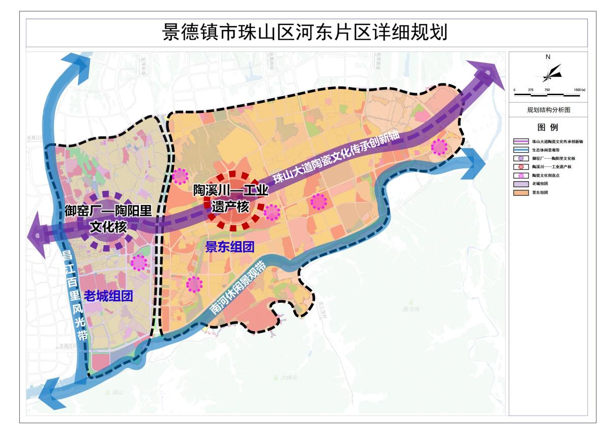 以凤凰山-昌江山水格局为生态基底,以御窑厂、湖田窑、陶溪川等历史文化资源为核心底蕴,聚焦文化遗产活态传承、老城活力复兴、全域文旅体验、山水宜居社区建设四大功能,打造集中展示“国际瓷都”价值特色的核心功能区。