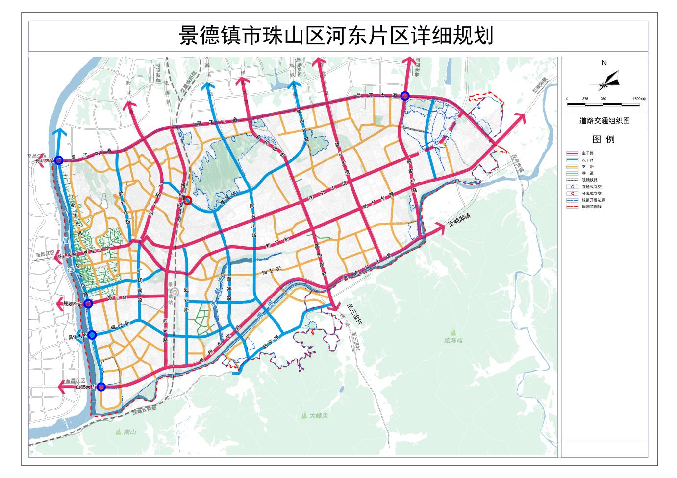 规划总体上形成“五横五纵”主要干路网结构。“五横”为昌江大道、珠山大道、马鞍山路-新厂路、浙江路、景德大道;“五纵”为广场北路、通站路、陶阳路、建设大道、何家桥路。
