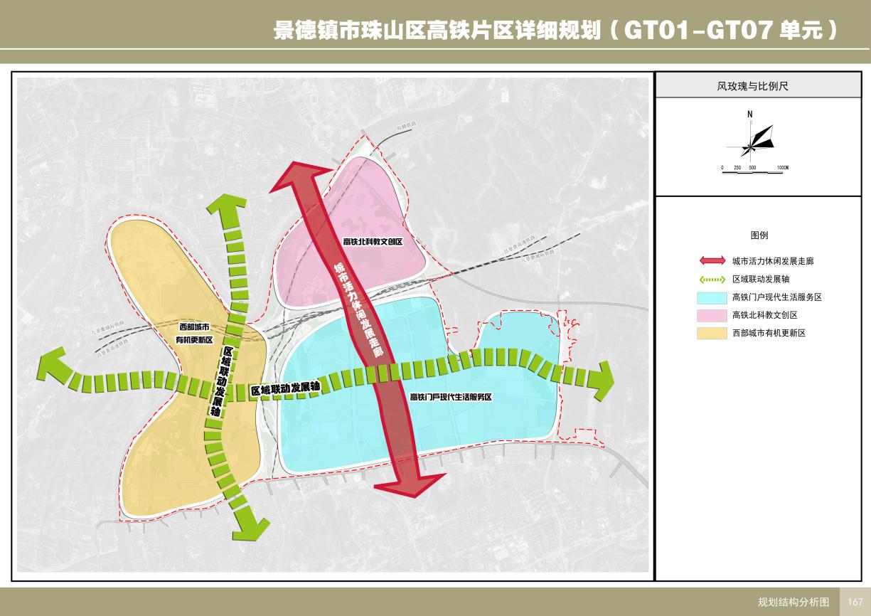 高铁片区规划形成“一廊、两轴、三区”的规划结构。