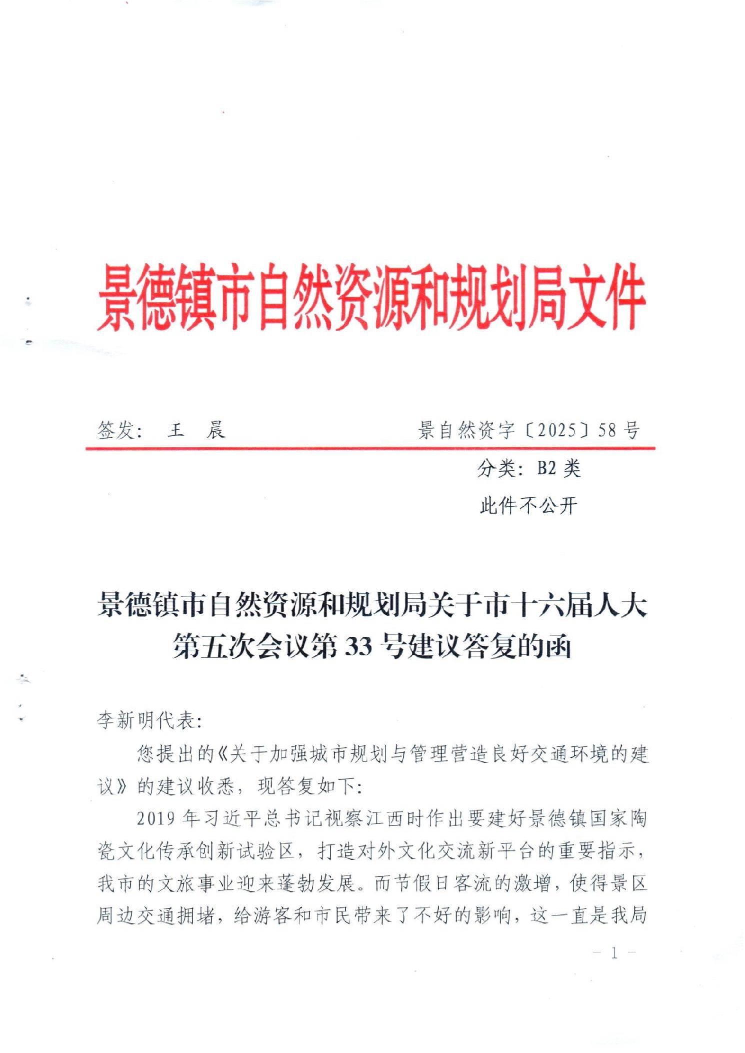 景德镇市自然资源和规划局关于市十六届人大第五次会议第33号建议答复的函