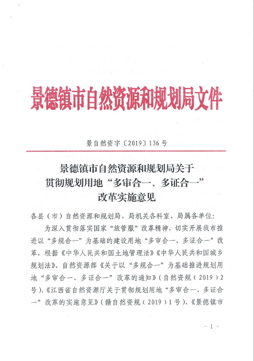 景德镇市自然资源和规划局关于贯彻规划用地“多审合一、多证合一’改革实施意见