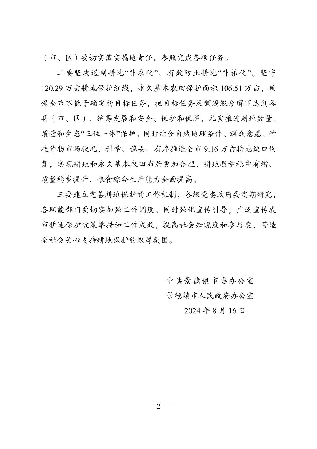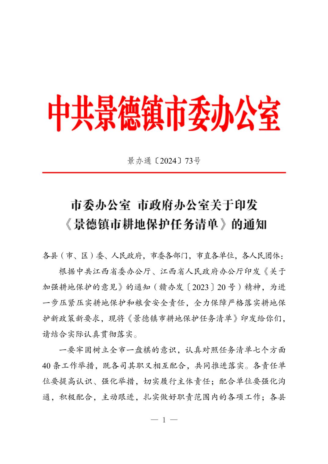 景德镇市委办公室 景德镇市政府办公室关于印发《景德镇市耕地保护任务清单》的通知2024-8-7(1).docx