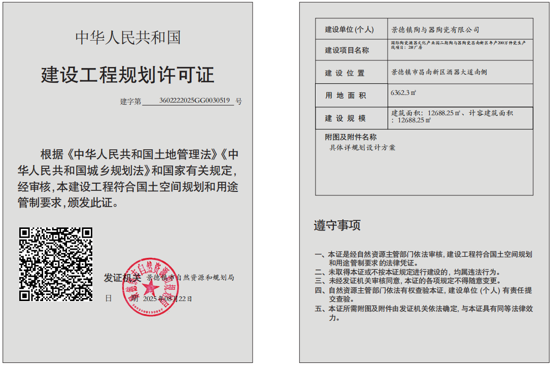 国际陶瓷酒器文化产业园二期陶与器陶瓷昌南新区年产200万件瓷生产线项目:2#厂房建设工程规划许可证
