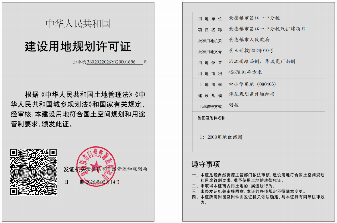 景德镇市昌江一中分校改扩建项目建设用地规划许可证