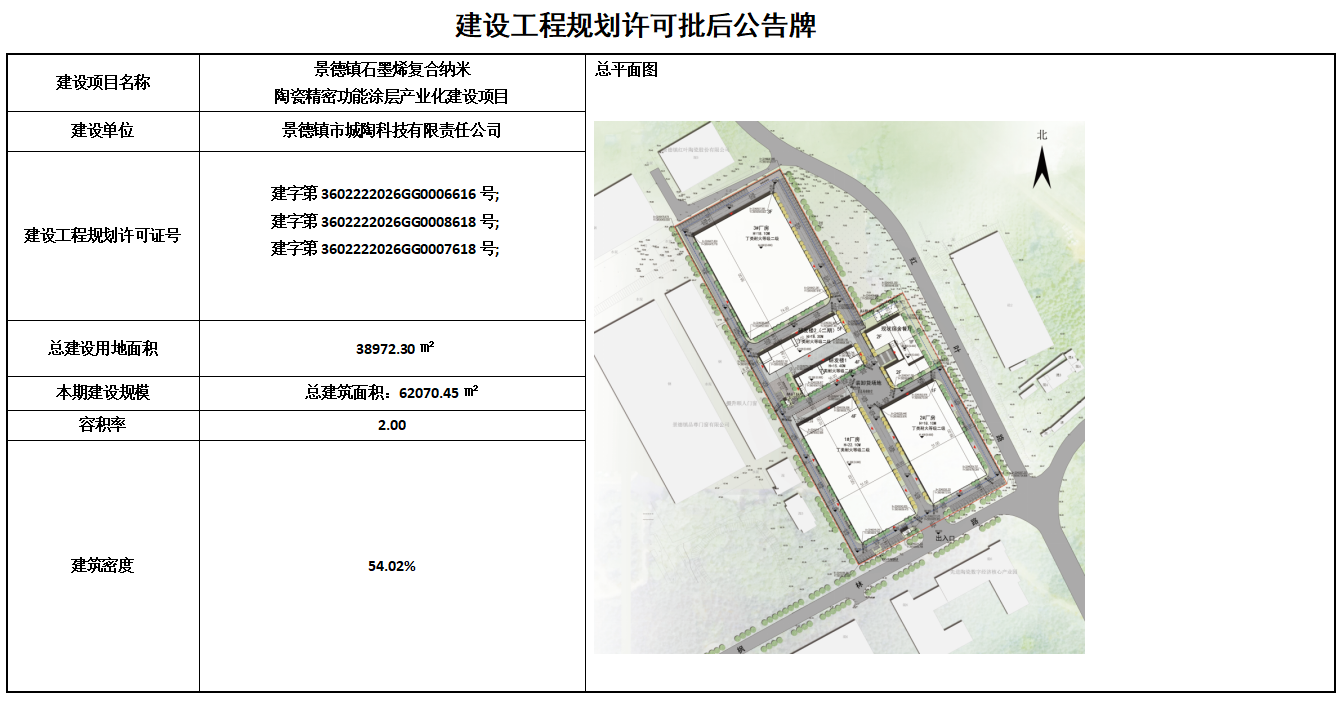 景德镇石墨烯复合纳米陶瓷精密功能涂层产业化建设项目建设工程规划许可批后公告牌