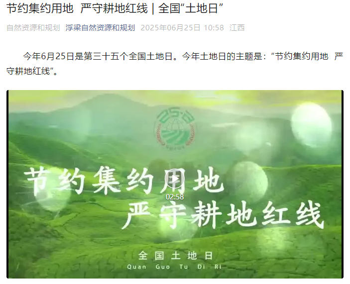 同时,全市自然资源和规划系统采取“线上线下”相组合的形式开展主题宣传活动。一是景德镇市自然资源和规划局昌江分局将永久基本农田标识牌“上田头”,给农田办“身份证”保护耕地,标识牌不仅标注了永久基本农田布局图,还印有基本农田保护“四个严禁”和耕地保护“六个严禁”等内容,通过图文并茂的方式,将政策送到村民家门口。并通过景德镇日报、景德镇市新闻联播、景德云媒同步进行宣传。二是乐平市自然资源和规划局紧紧围绕活动主题,于6月5日上午在天湖公园广场设立展场,开展了内容丰富、形式多样的“6·25全国土地日”主题宣传活动。三是浮梁县自然资源和规划局精心制作以“节约集约用地 严守耕地红线”为主题的全国土地日宣传视频,采取线上宣传方式开展相关宣传活动。